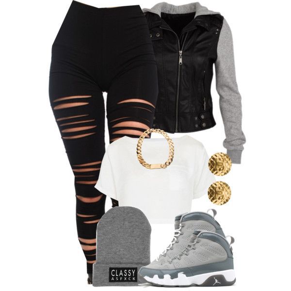 I get up, take a shower, and put on ripped leggings, and white crop top, and Jordan 9 Cool Grey. I then put on a tight black leather jacket with grey sleeves over my white shirt,